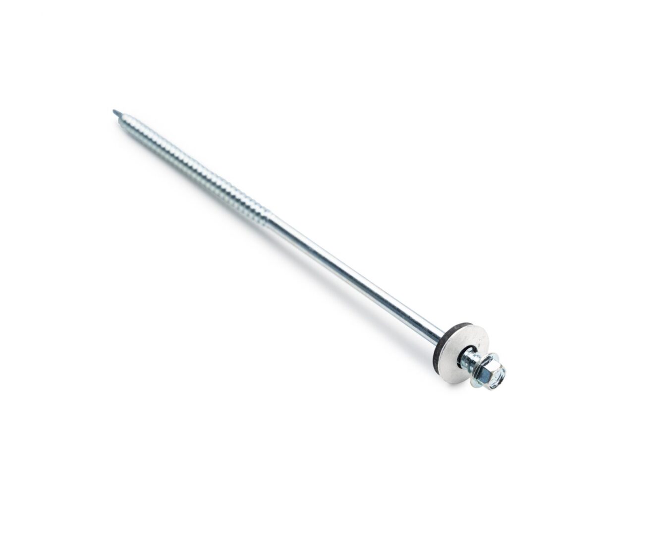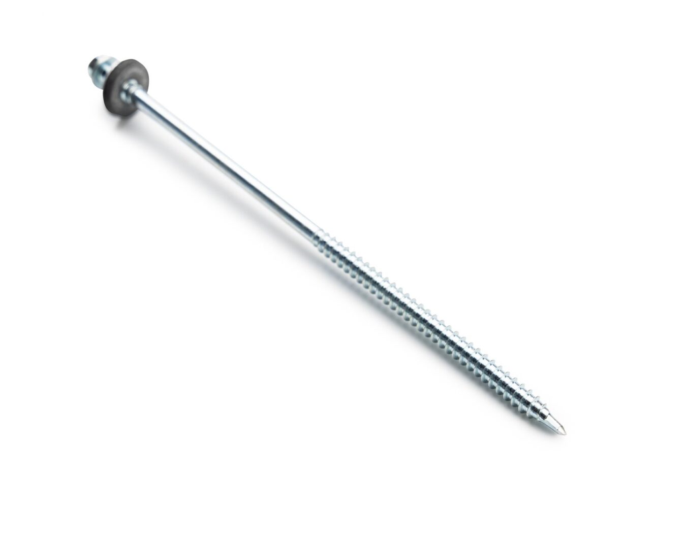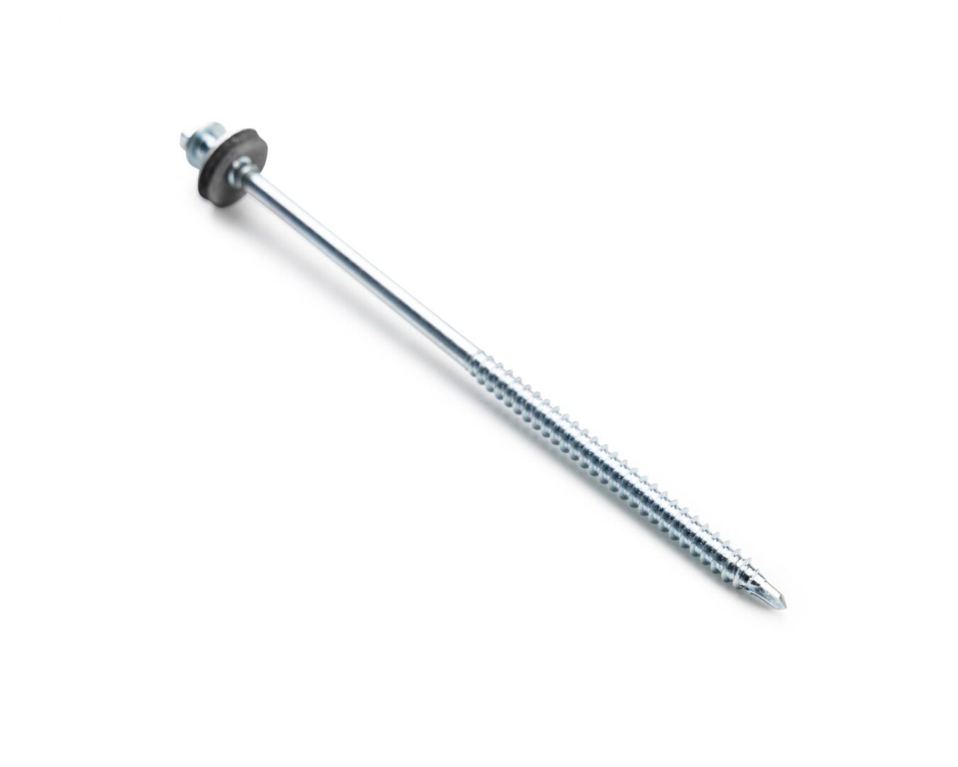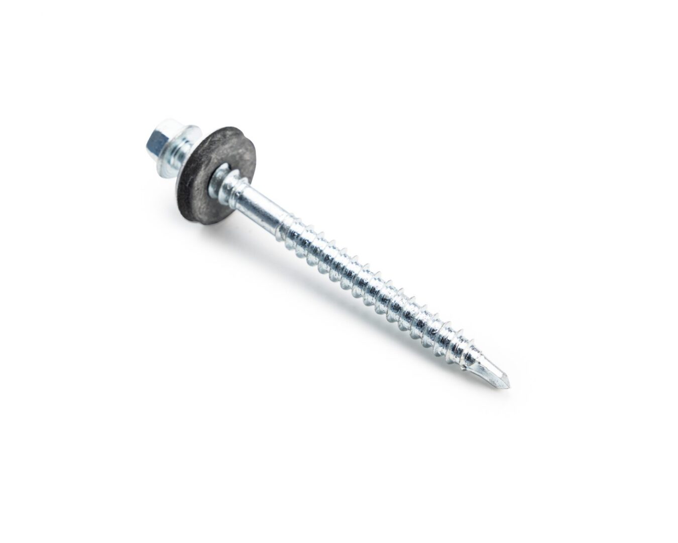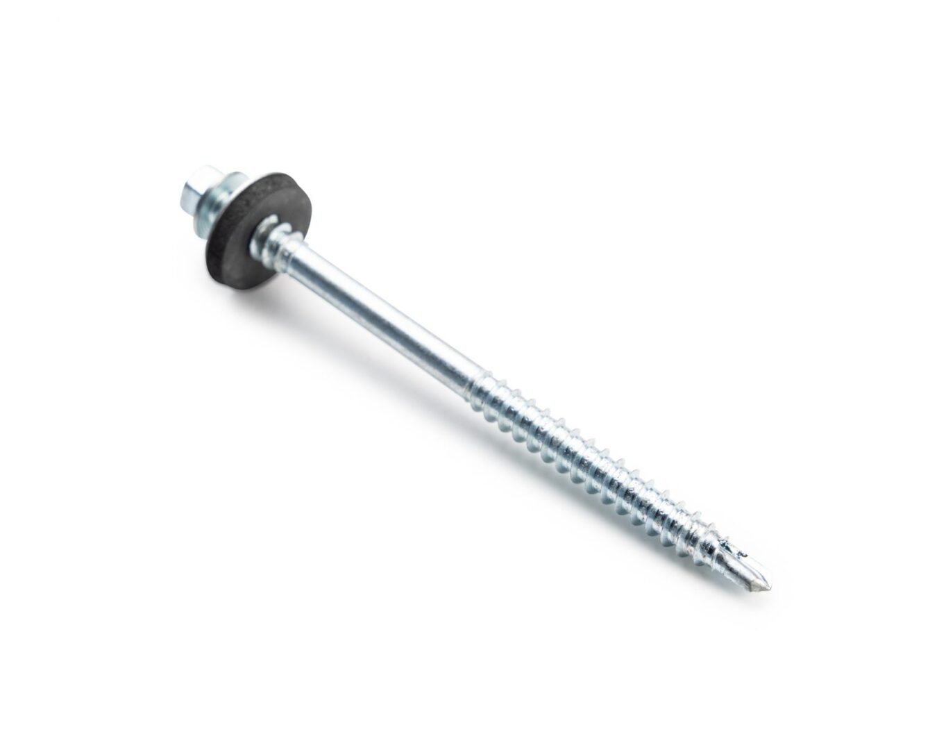 Zelftappende verzinkte schroeven met EPDM-ring, verkrijgbaar in 125, 145, 165 of 185 mm. Waterdicht, duurzaam en verpakt per 100 stuks in Aluzinc-kleur.